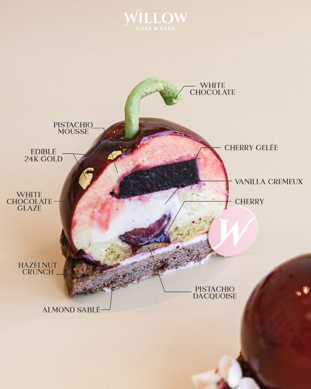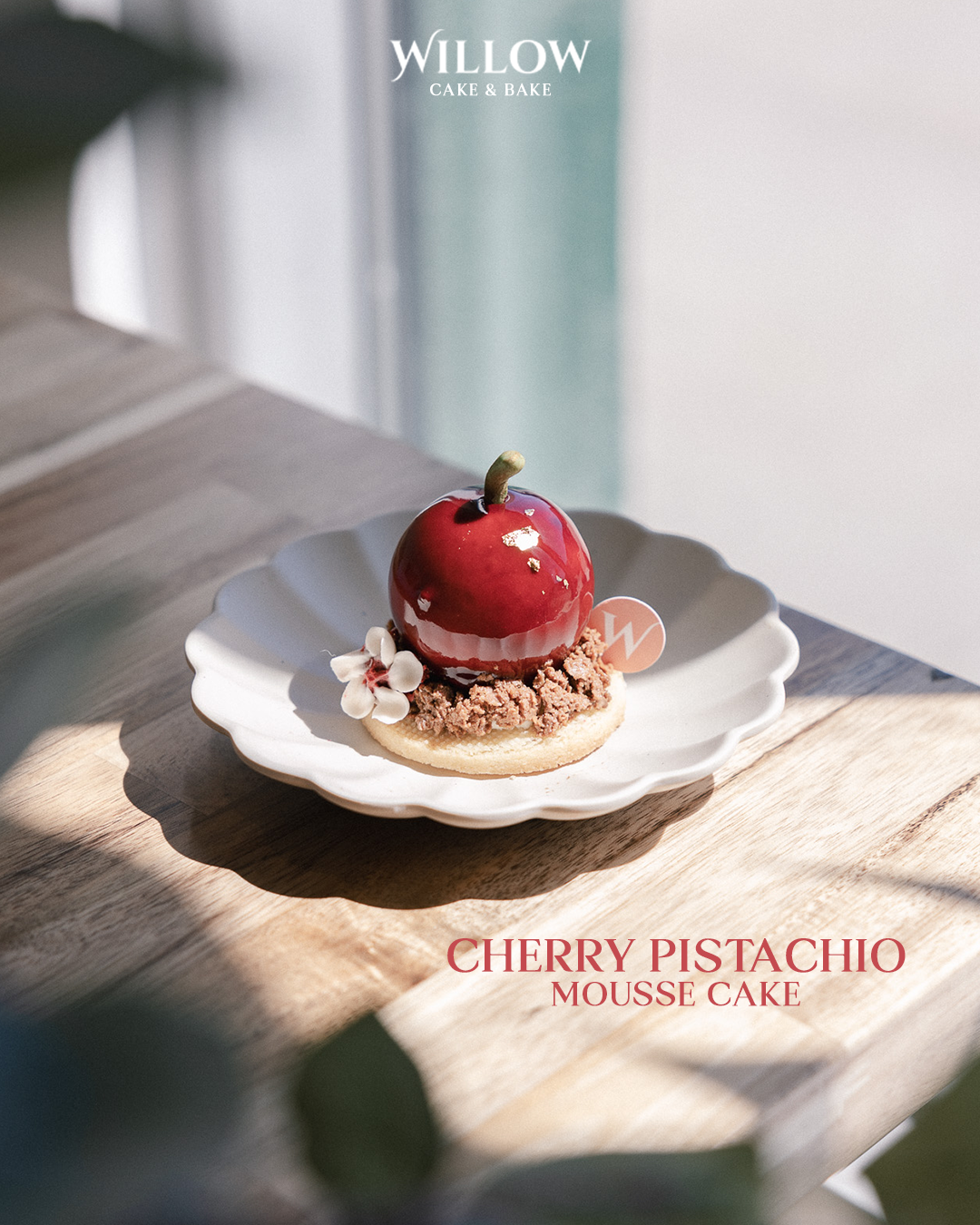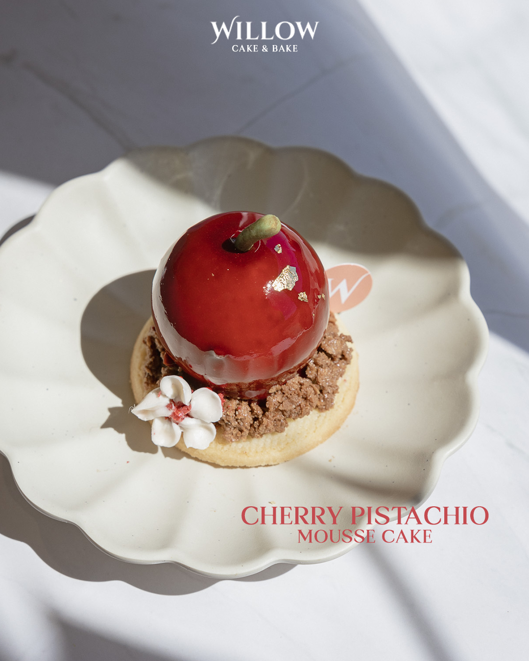 "Experience the elegance of our Cherry Pistachio Mousse Cake – a delicate blend of rich flavors and artistic presentation."