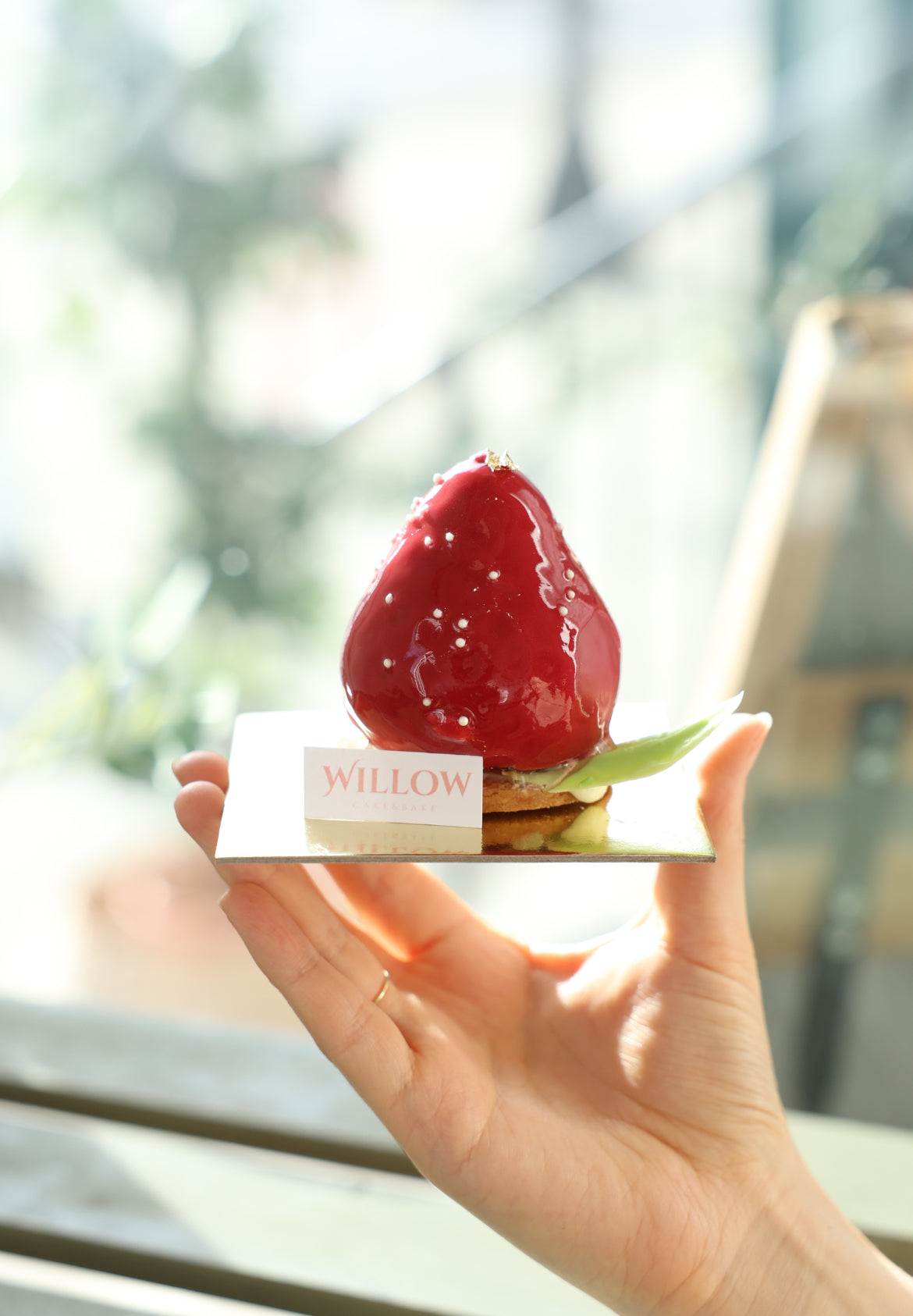 “Strawberry Crème: A luscious strawberry mousse cake filled with strawberry and raspberry clove compote, encased in raspberry chocolate for a decadent finish.”
